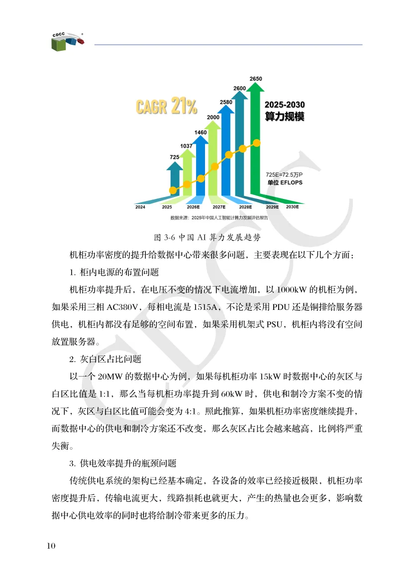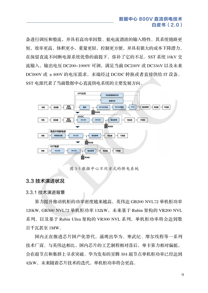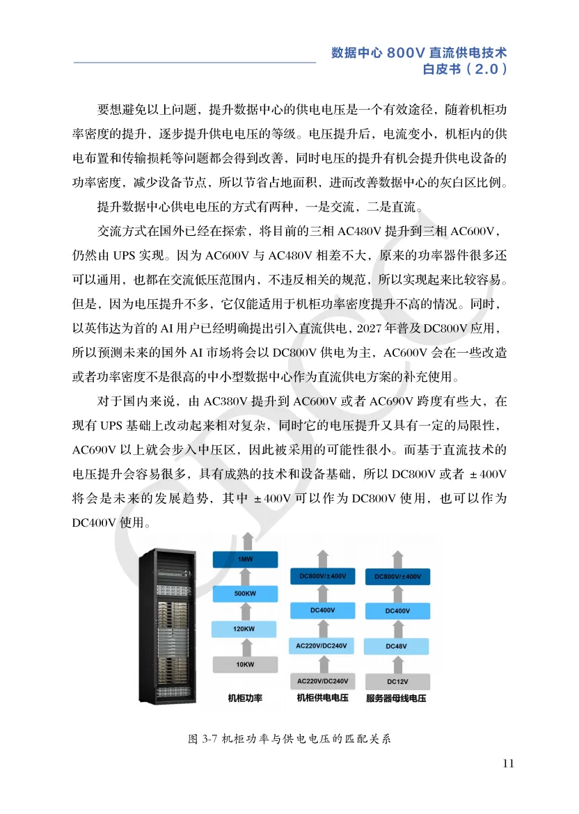 从技术演进来看,数据中心供电系统正从传统交流向高压直流过渡。随着AI芯片功耗提升,单机柜功率密度持续增长,传统交流供电在柜内电源布置、灰白区占比、效率提升等方面遭遇瓶颈,而800V直流供电通过提升电压等级,解决了高密机柜供电难题,同时便于分布式新能源接入,可实现光伏、储能等直流系统的无缝对接,减少逆变环节,提升新能源利用率。