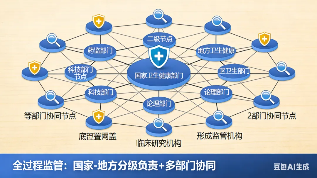 根据第六条,我国已建立起从国家到地方的卫生健康部门分级监管体系,并强调多部门协同管理。这一清晰的权责划分旨在实现全过程、无死角的监督,保障临床研究与转化的安全与质量。