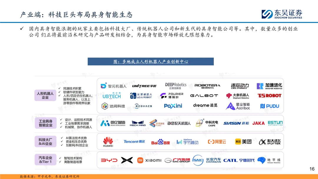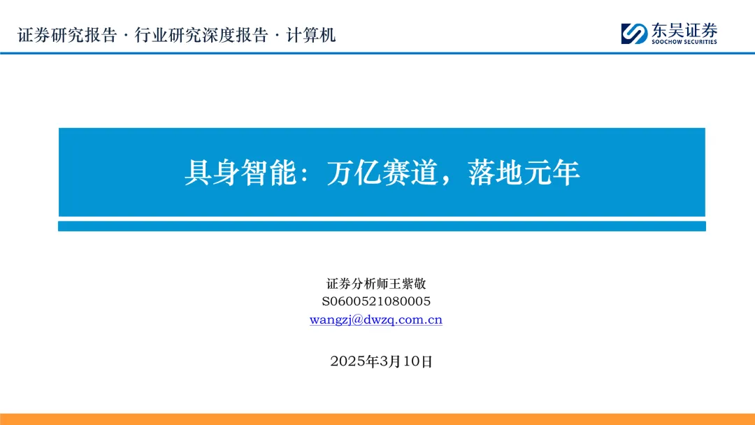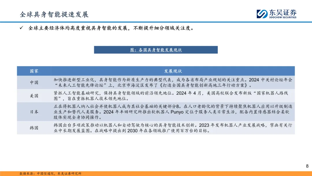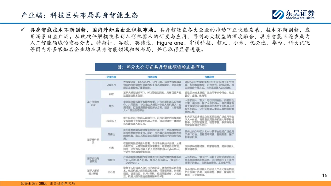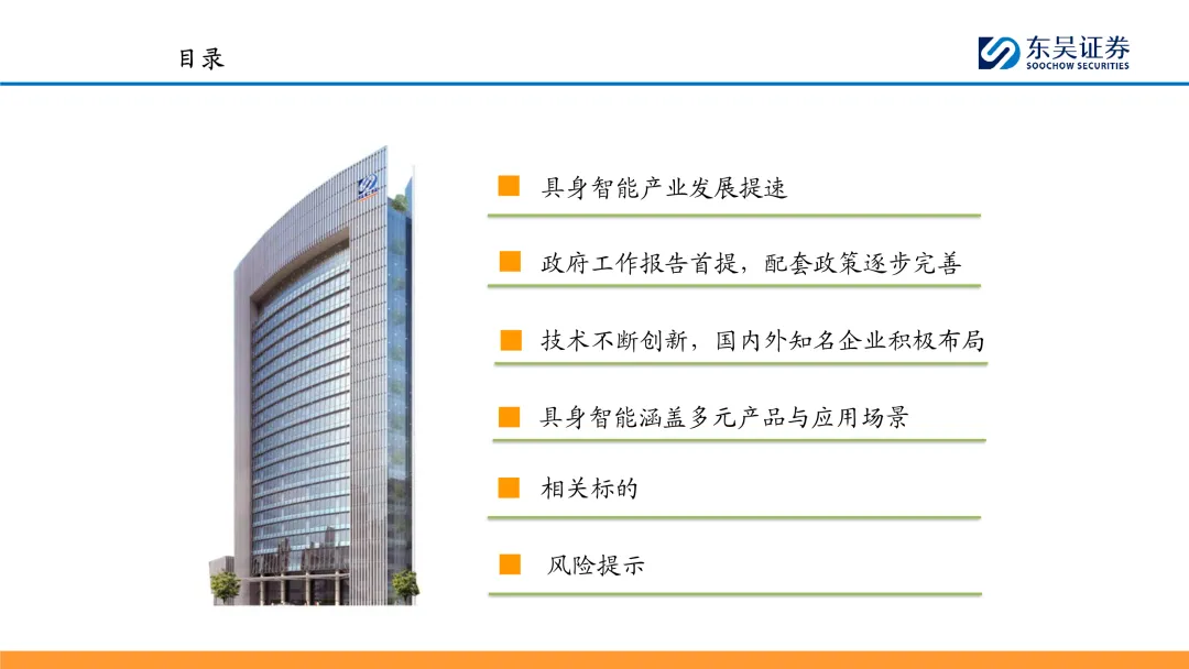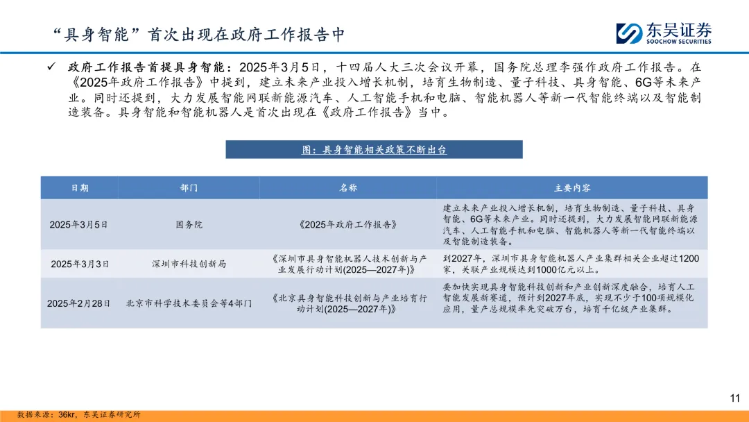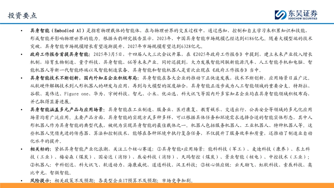 政府工作报告首提具身智能:2025年3月5日,十四届人大三次会议开幕,在《2025年政府工作报告》中提到,建立未来产业投入增长机制,培育生物制造、量子科技、具身智能、6G等未来产业。同时还提到,大力发展智能网联新能源汽车、人工智能手机和电脑、智能机器人等新一代智能终端以及智能制造装备。具身智能和智能机器人是首次出现在《政府工作报告》当中。 具身智能技术不断创新,国内外知名企业积极布局:具身智能在各大企业的推动下正快速发展,技术不断创新,应用场景日益广泛。