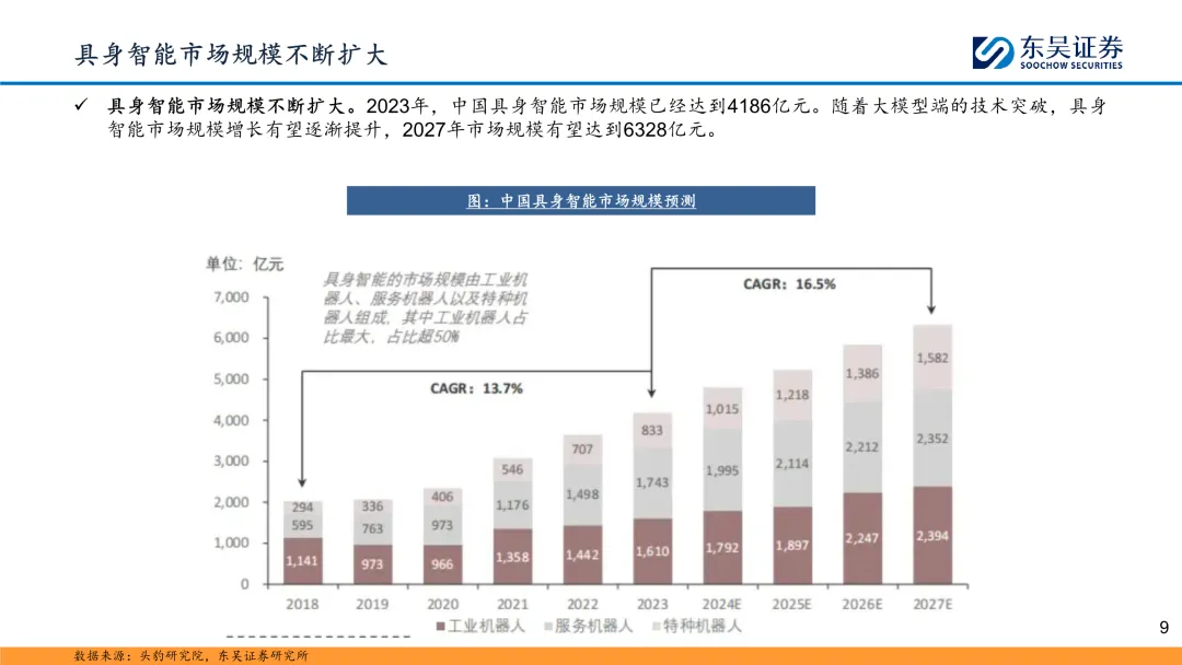 具身智能(EmbodiedAI)是指有物理载体的智能体,在与物理世界的交互过程中,通过感知、控制和自主学习来积累知识和技能,形成智能并影响物理世界的能力。根据头豹研究报告显示,2023年,中国具身智能市场规模已经达到4186亿元。随着大模型端的技术突破,具身智能市场规模增长有望逐渐提升,2027年市场规模有望达到6328亿元。