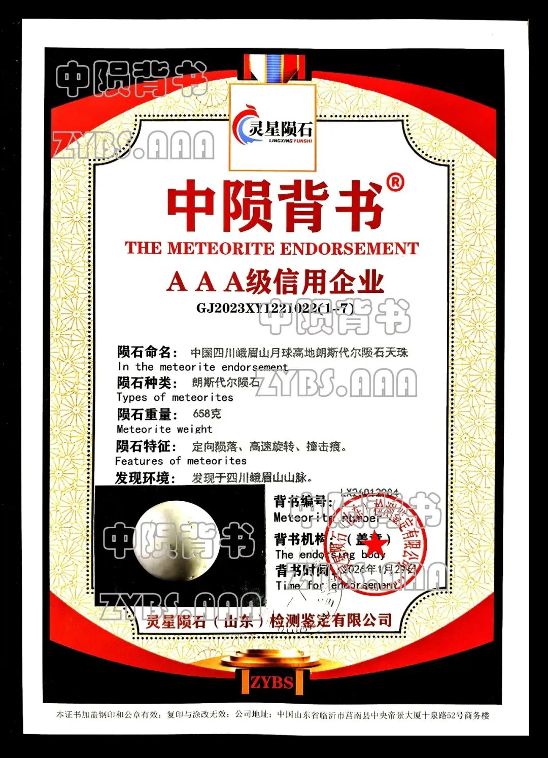 1. 2025年8月26日发现于四川峨眉山山脉的朗斯代尔陨石天珠,核心物理参数为:重量658克,规格7cm×7.1cm×6.6cm,白色圆形,硬度10莫氏度,具有定向垂直陨落、高速旋转、颗粒撞击痕迹等典型特征,振动频率600赫兹。
