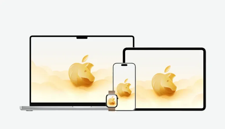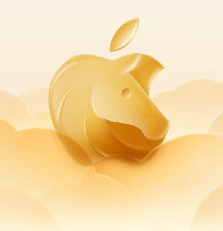 Apple2026马年生肖Logo整体色调以金色为主,采用了苹果推出的液态玻璃风格,巧妙将苹果标志与马年生肖图案相融合。Logo中苹果标志镶嵌在层叠的金色渐变之中,不仅强化了视觉层次,也象征着马年奔腾向前、生机无限的寓意。