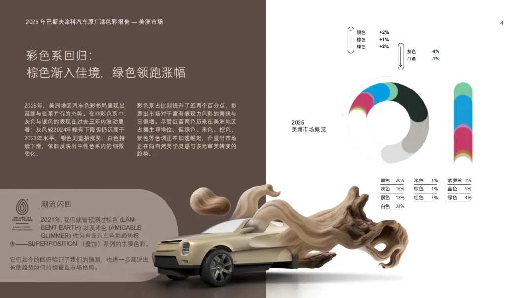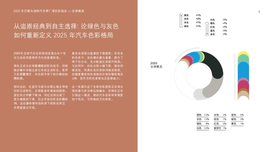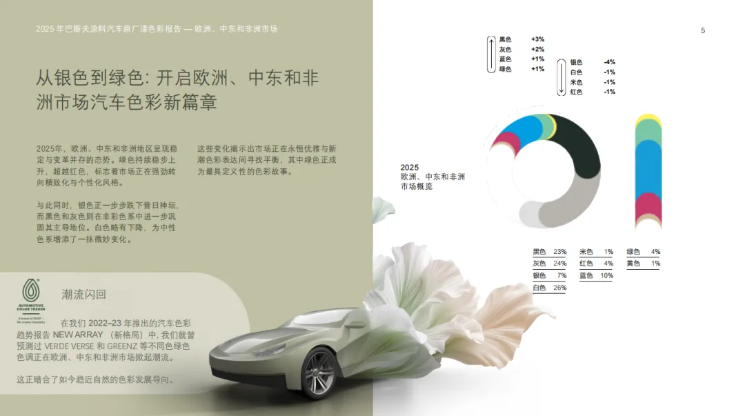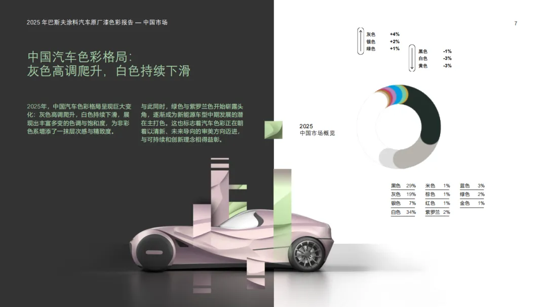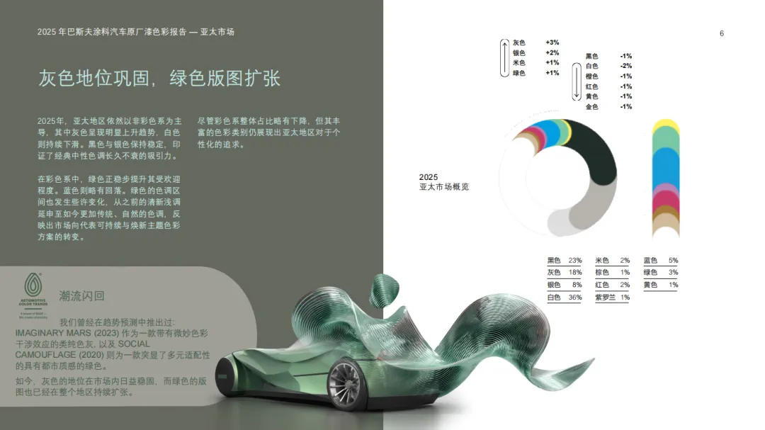 巴斯夫涂料业务部最新发布的2025年《巴斯夫汽车原厂漆色彩报告》中分析指出——全球汽车色彩格局呈现出显著转变,消费者继续远离传统色彩偏好,个性化与自然灵感美学成为主流趋势。