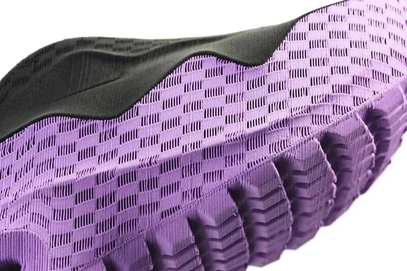 原型图清晰地展现了色彩的分割:紫色底色从鞋底延伸至鞋面,在鞋款标志性的波浪形轮廓线处与黑色交汇,后跟处则搭载了对比鲜明的黑色Air气垫。