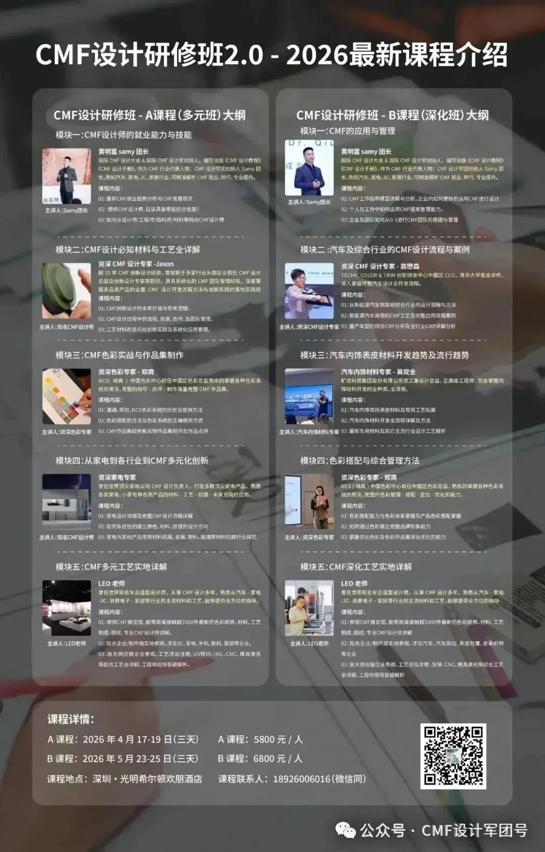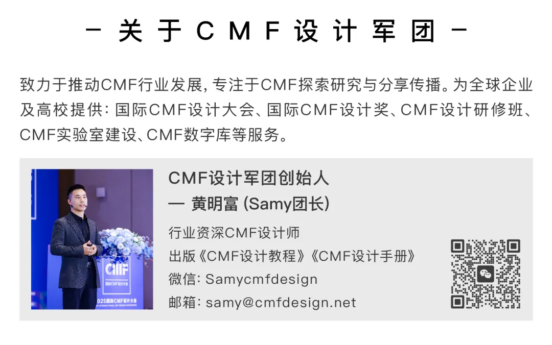 想了解更多CMF内容吗?欢迎大家点击下方关注我们公众号,每日8点15,定时发布文章。另外,公众号右上角有搜索按钮,可以快速查找平台早期发过的文章内容哦~~ 近期精选文章推荐: 超级CMF干货 | 如何通过品牌文化资本激活品牌记忆? 水晶在汽车内外饰的应用、工艺解读及发展趋势,高端车型都在用 一块标准色板,如何解决工业制造的色差问题 巴斯夫最新发布:2025年汽车原厂漆色彩报告! 必收藏CMF干货!企业打造品牌记忆的全面深度解析(上篇) 小米官方:揭秘新一代SU7卡布里蓝颜色设计故事及材料工艺 为何要用竹子做产品CMF设计?已横跨汽车、消费电子等多个领域 新一代小米SU7将于4月上市,内外饰设计提前看! 小米17 Ultra“星空绿”新配色发布,撒点星空肌理,设计解析 小米Watch 5亮相,行业首发3D打印一体成型钛合金表带 采用独特技术方案,看菌丝体到蘑菇皮革的工艺之旅! iPhone未来2年产品路线图揭秘!从折叠屏到全玻璃机身等 CMF趋势专栏:产品发光设计,情感联系+氛围营造 精选:劳斯莱斯10款顶奢内饰面板,CMF设计解析+欣赏 多图 | 100例“极简”产品设计欣赏! 华为官方:揭秘Mate 80全金属机身版设计历程与材料工艺 看3D微纹纹理工艺在不同行业产品上的应用(详细版) 全面解读钛金属11大表面处理工艺!阳极|拉丝|结晶|镀膜|激光|喷砂等 苹果折叠屏iPhone新进展:富士康已搭建专属生产线 苹果官方揭秘:Apple Watch钛金属表壳3D打印工艺流程详解 盘点2025年内饰中别具一格的CMF设计:竹木|凝光贝母|透明发光|泡沫铝|麦秆镶嵌等 OPPO推出Reno15系列,首发全息光刻裸眼3D图案后盖,设计解析 全球首款量产液冷智能手机发布!后盖透明发光,能看到液体流动 【超级CMF干货】IMD、OMD模内外装饰膜片叠构 一份超专业的OMD制程工艺资料分享给大家,40页PPT值得收藏! 智能CMF | 汽车内外饰3D立体烟花灯是什么? 一文了解麦秆镶嵌工艺,汽车内饰|家居|穿戴|珠宝等都在用 一文全面了解3D薄膜装饰技术OMD,为产品穿上华丽外衣 苹果最新3款智能手表发布,CMF设计亮点总结 iPhone 17系列发布,CMF设计亮点汇总,材料工艺解读 CMF干货 | 模具晒纹(咬花)工艺流程介绍【完整版】 继华为手机后,汽车内饰竟首发车规级凝光贝母工艺!用于智界新车 CMF | 汽车内饰常见的7种透光材料及应用,你都了解吗? 干货解读!3D微纹压印技术,汽车|家电|3C等行业都在用 当下火热的AI/AR智能眼镜15大外观材料盘点,解读+产品案例 【干货】产品设计流程全过程解析 集科技与时尚:有机硅透光皮革在汽车内饰中有哪些应用? 一文了解宝马|BYD|沃尔沃等都在用的高端“水晶”饰件及供应商 双色双肌理外壳你喜欢吗?盘点手机产品中出现的经典案例 电子烟外壳7大特色表面处理工艺盘点,冰花漆|变色|皮质|多彩等 11大手机后盖材质系统盘点,玻璃|复合板|玻纤|陶瓷|素皮|木材|纤维等