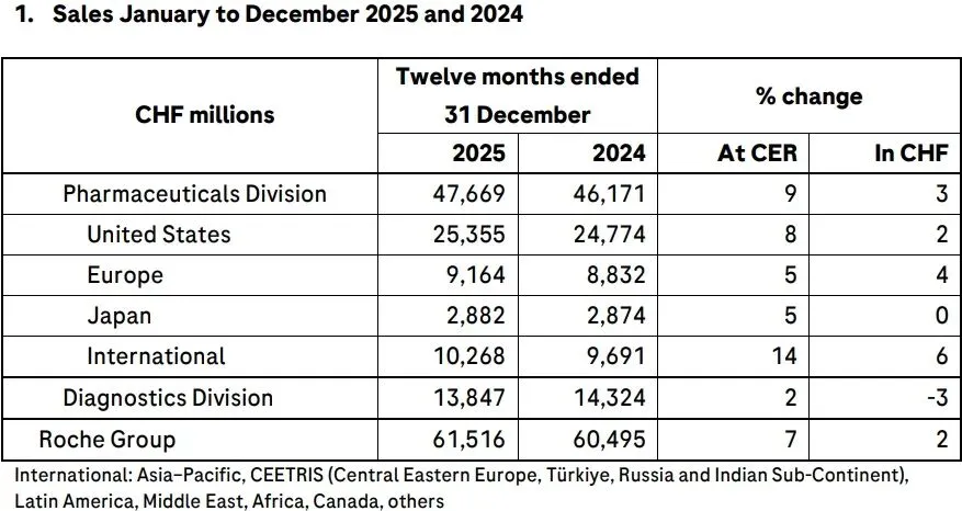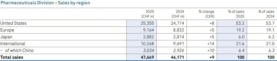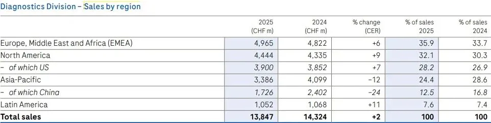 从地区来看,制药业务中美国是最大收入来源,共收入253.55 亿瑞士法郎,同比增长8%。聚焦中国区,2025年罗氏制药业务同比增长10%,收入30.34亿瑞士法郎,但诊断业务收入严重下滑,同比下降24%至17.26亿瑞士法郎。