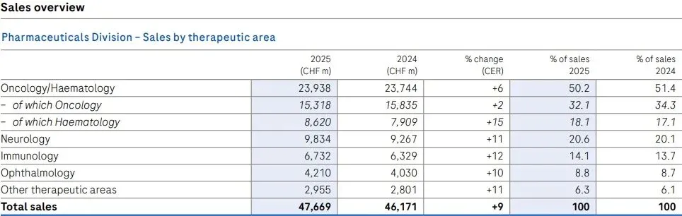 细看制药业务,2025年罗氏各治疗领域均保持增长趋势,其中肿瘤领域是最大收入来源,共收入239.38亿瑞士法郎,同比增长6%。神经科学、免疫、眼科领域增长明显,分别同比增长11%、12%和10%。