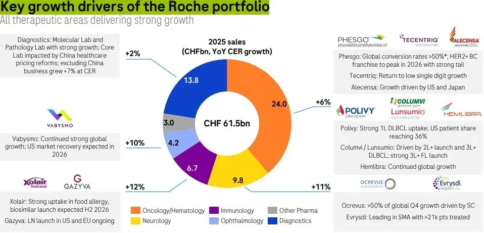 具体品种来看,Phesgo、Xolair、Ocrevus、Hemlibra、Vabysmo 五大重磅产品成为拉动罗氏制药业务的绝对核心,据统计这五款药物2025年合计销售额达214亿瑞士法郎,较2024年同比增加32亿瑞士法郎,这一增长不仅完全覆盖了Avastin、Herceptin等专利到期产品合计7亿瑞士法郎的销售额下滑,更成为制药业务增长的第一动力。同时Polivy等新晋品种表现亮眼,与2024年形成鲜明的增长格局,成为财报最亮眼的看点。