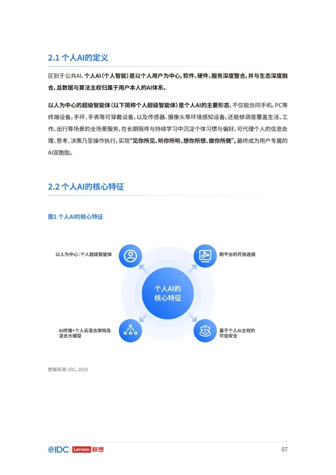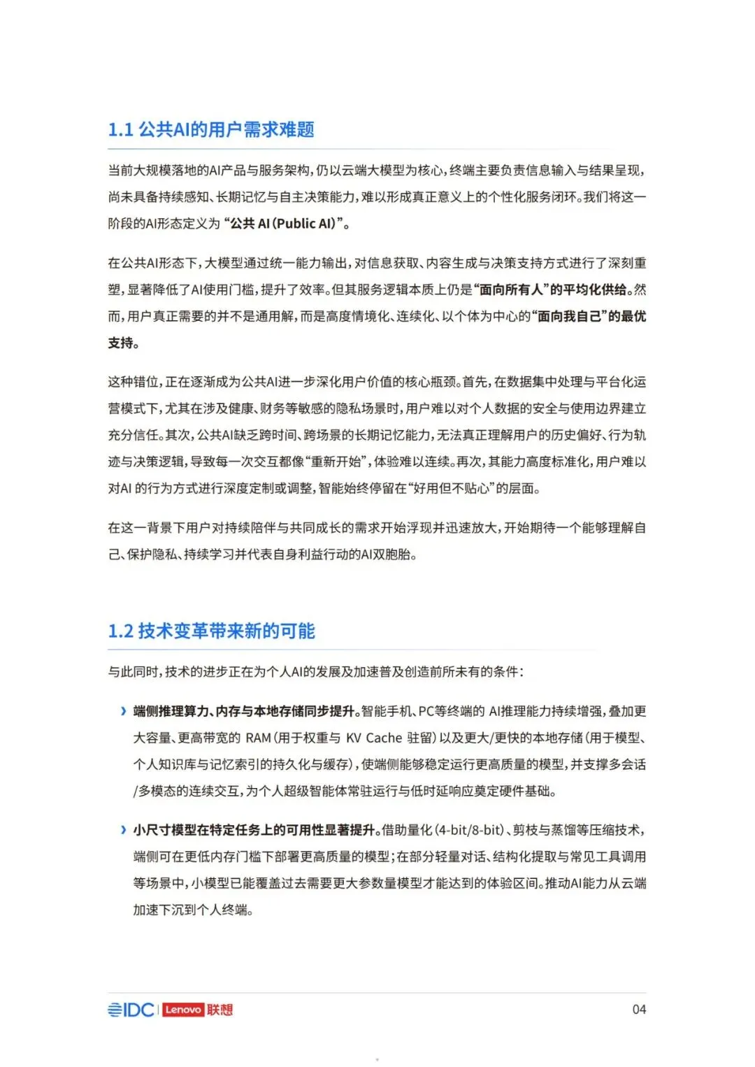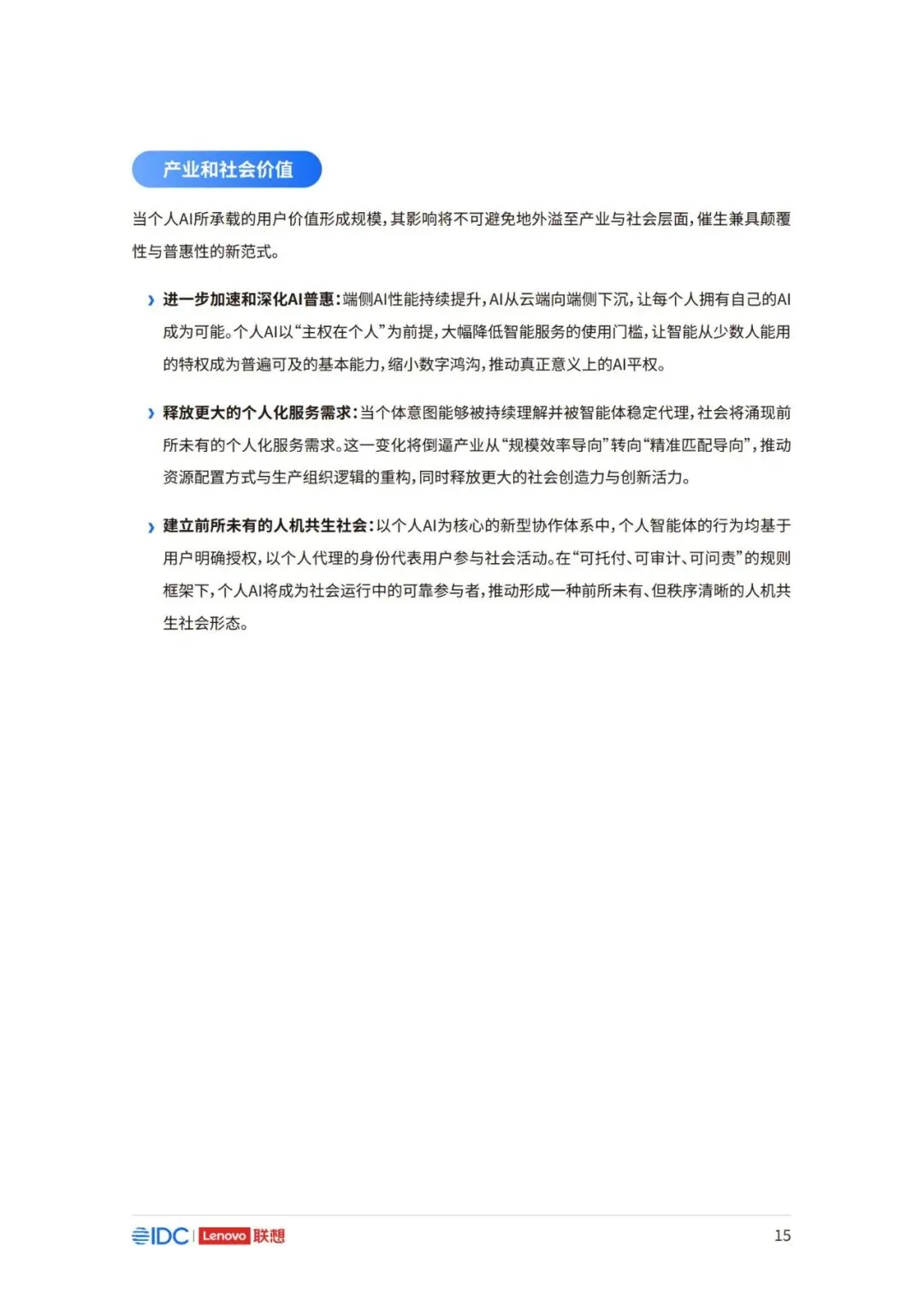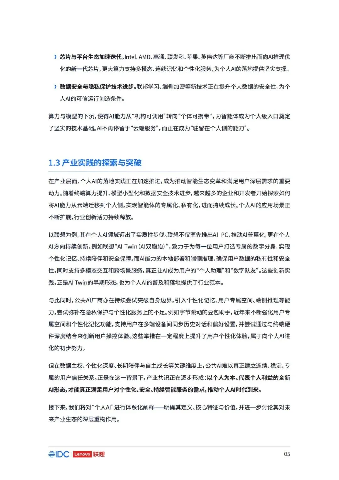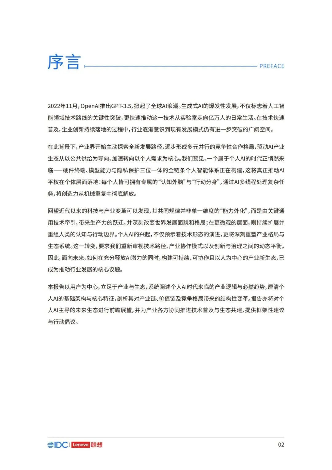 因此,面向未来,如何在充分释放AI潜力的同时,构建可持续、可协作且以人为中心的产业新生态,已 成为推动行业发展的核心议题。 本报告以用户为中心,立足于产业与生态,系统阐述个人AI时代来临的产业逻辑与必然趋势,厘清个 人AI的基础架构与核心特征,剖析其对产业链、价值链及竞争格局带来的结构性变革。报告亦将对个 人AI主导的未来生态进行前瞻展望,并为产业各方协同推进技术普及与生态共建,提供框架性建议 与行动倡议。