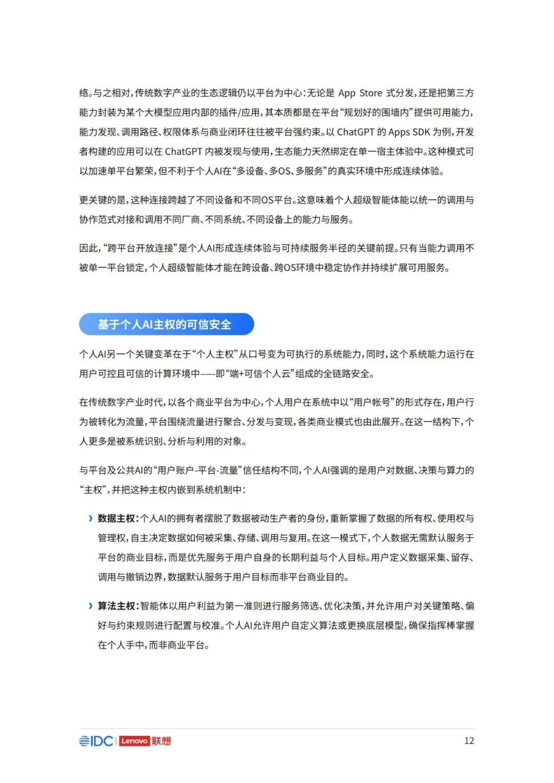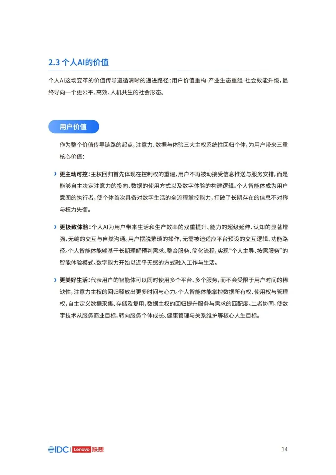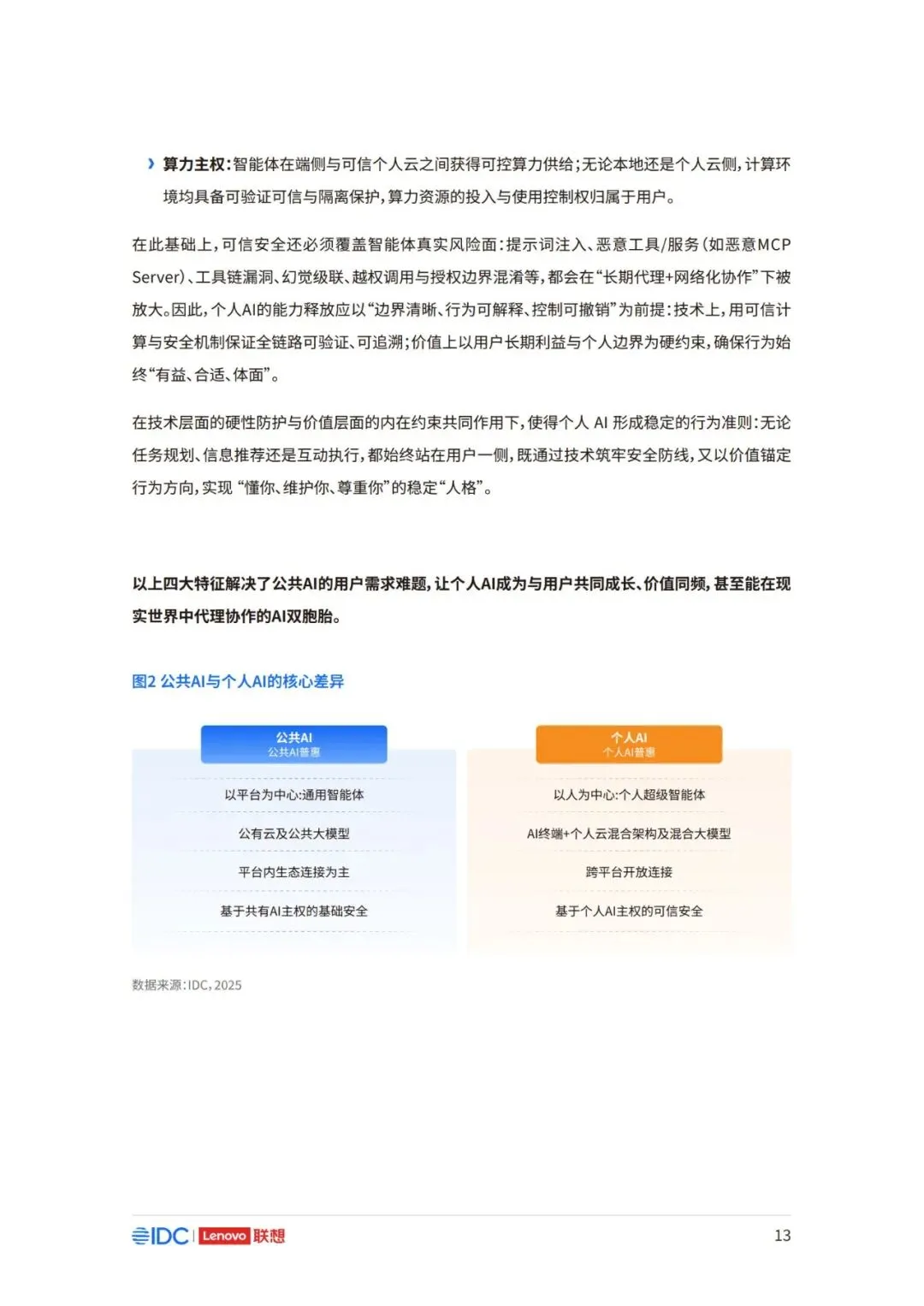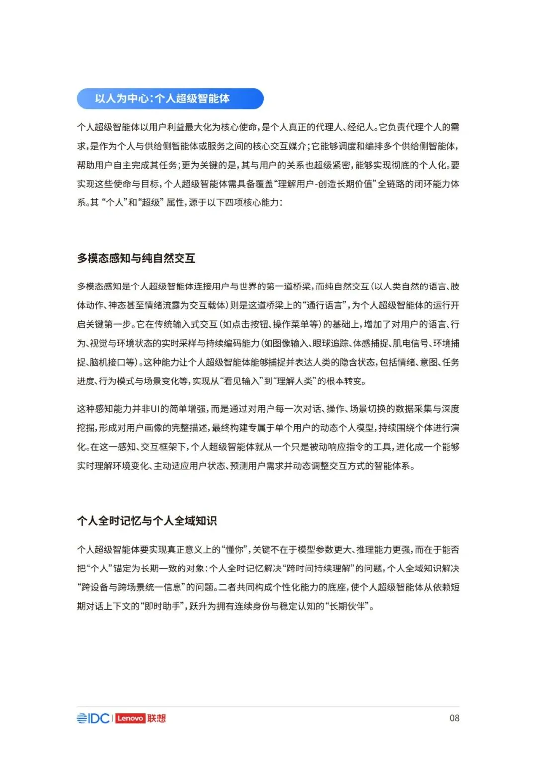 因此,面向未来,如何在充分释放AI潜力的同时,构建可持续、可协作且以人为中心的产业新生态,已 成为推动行业发展的核心议题。 本报告以用户为中心,立足于产业与生态,系统阐述个人AI时代来临的产业逻辑与必然趋势,厘清个 人AI的基础架构与核心特征,剖析其对产业链、价值链及竞争格局带来的结构性变革。报告亦将对个 人AI主导的未来生态进行前瞻展望,并为产业各方协同推进技术普及与生态共建,提供框架性建议 与行动倡议。