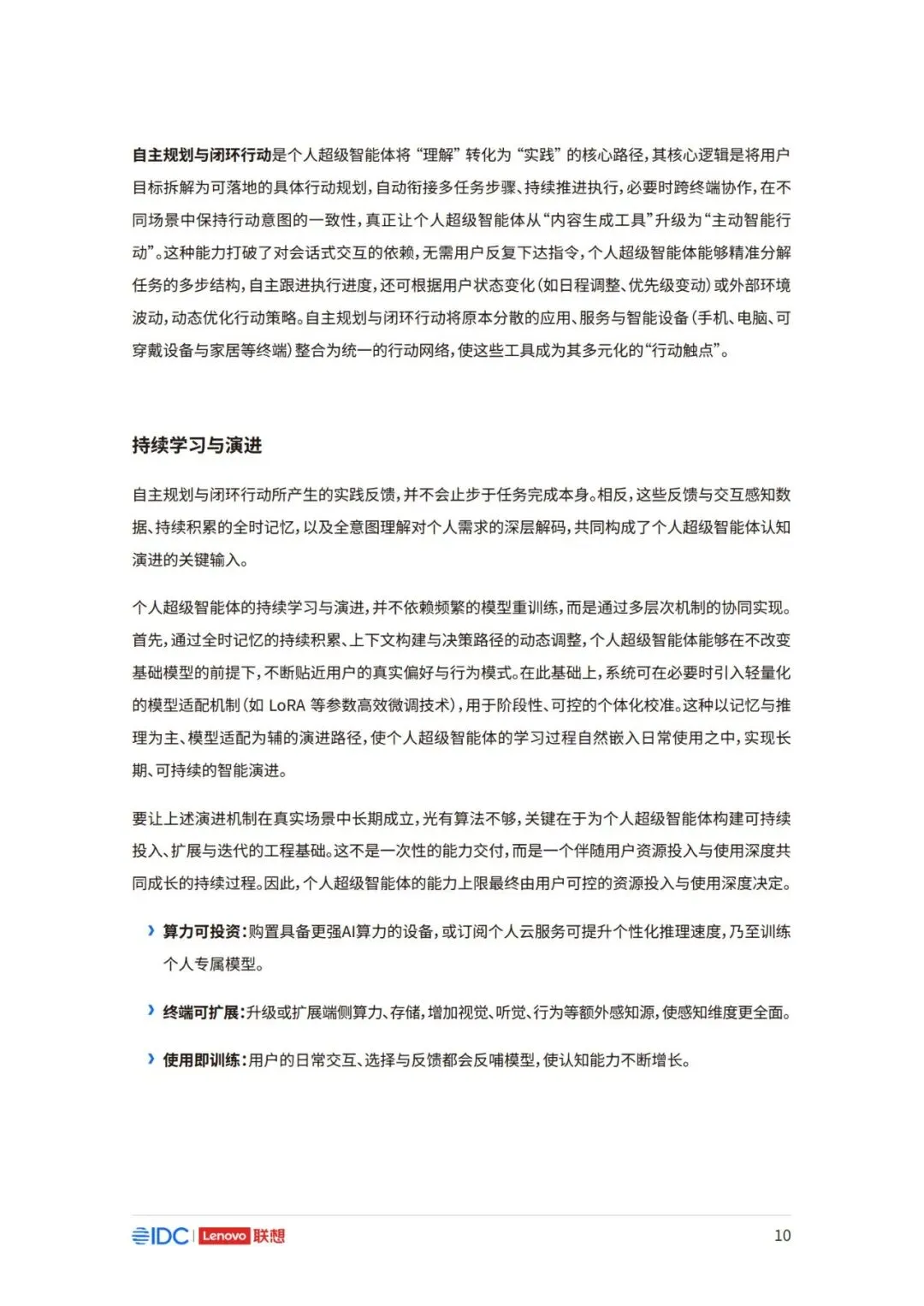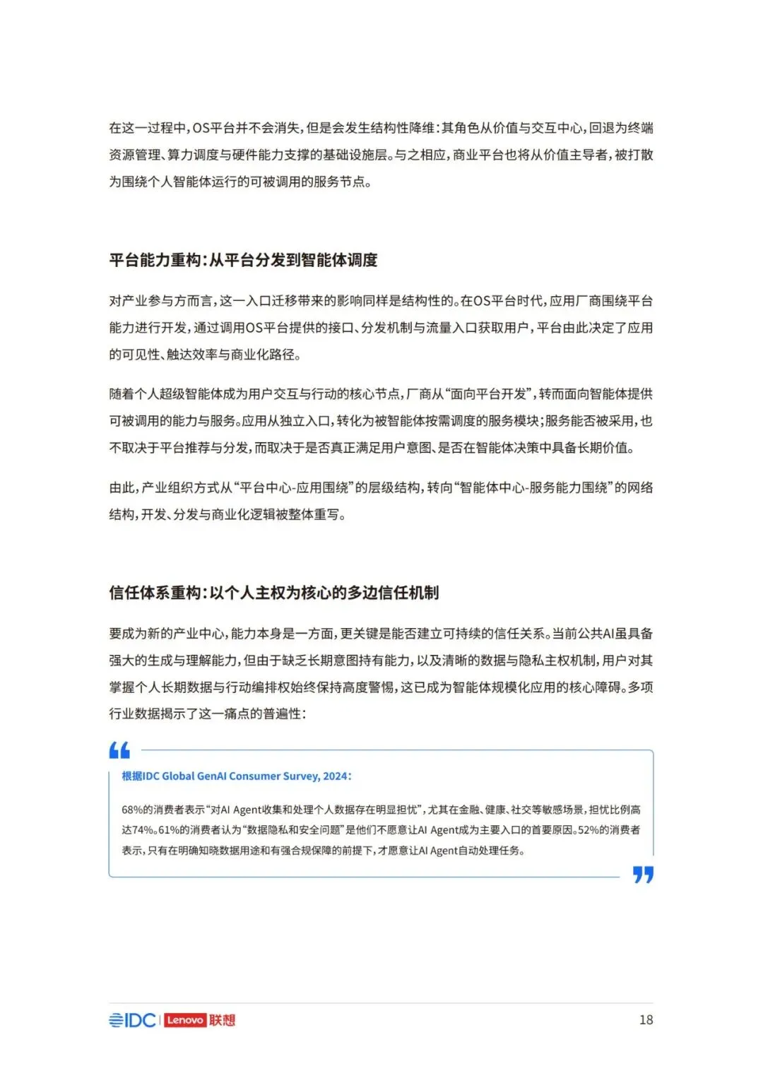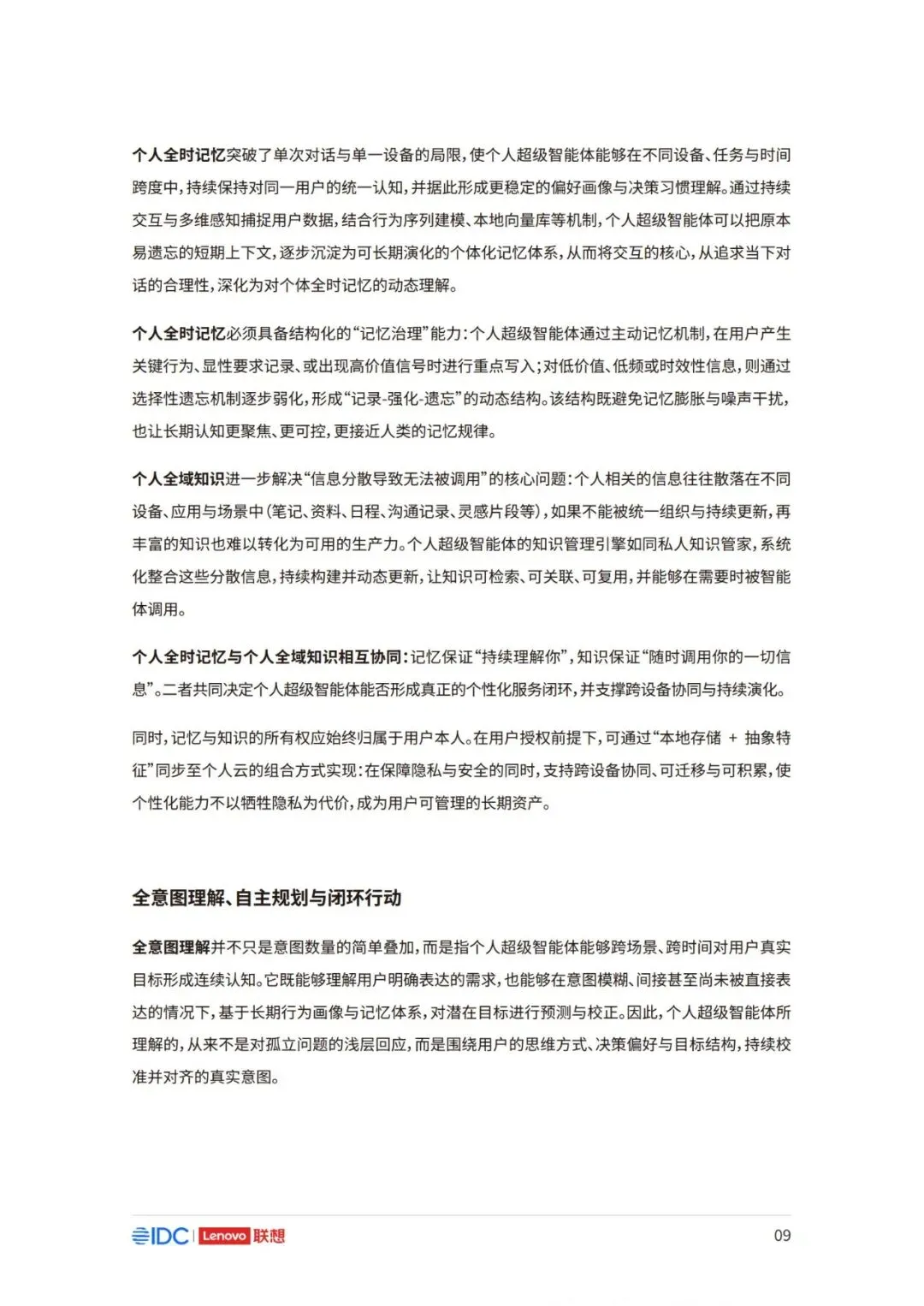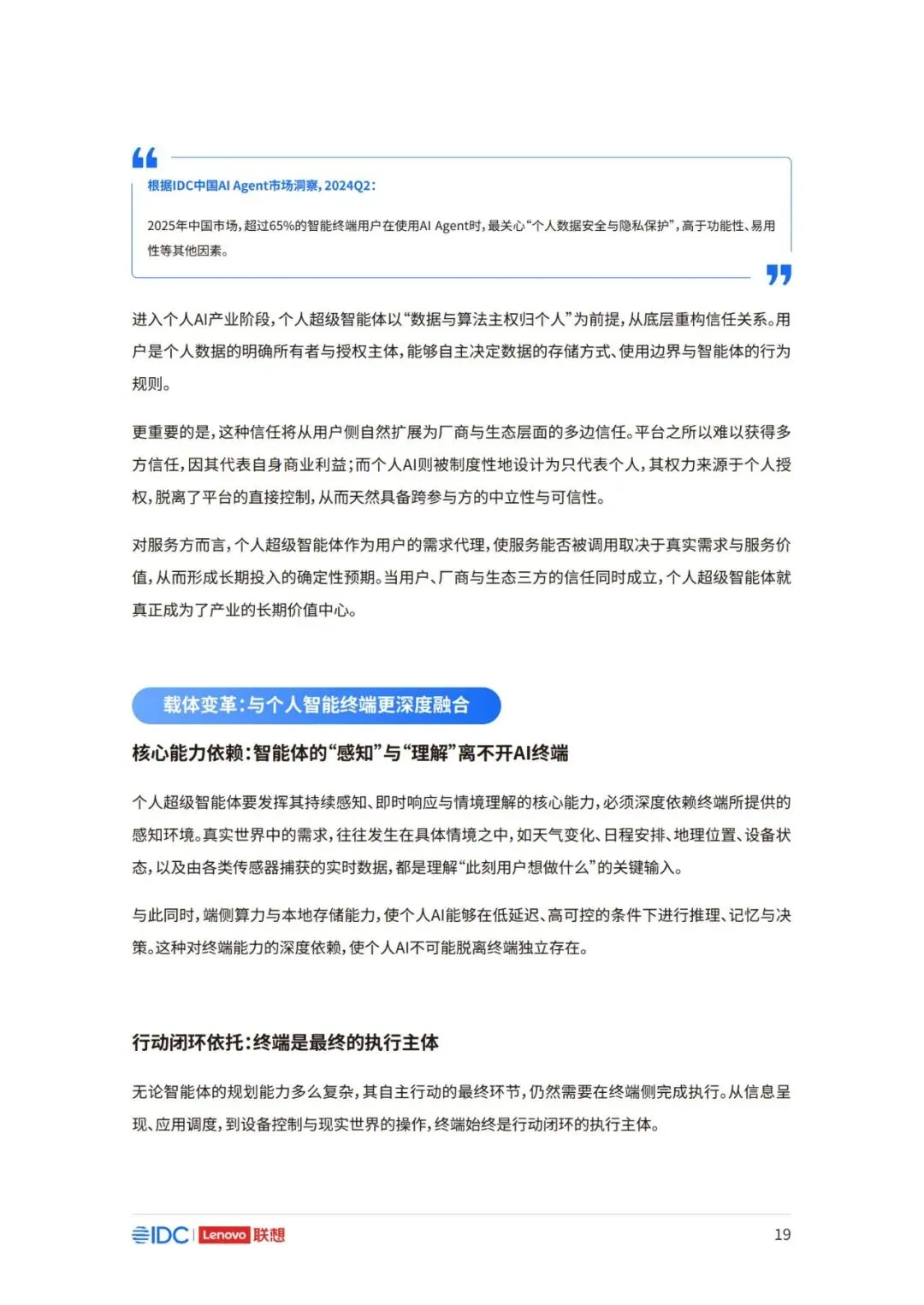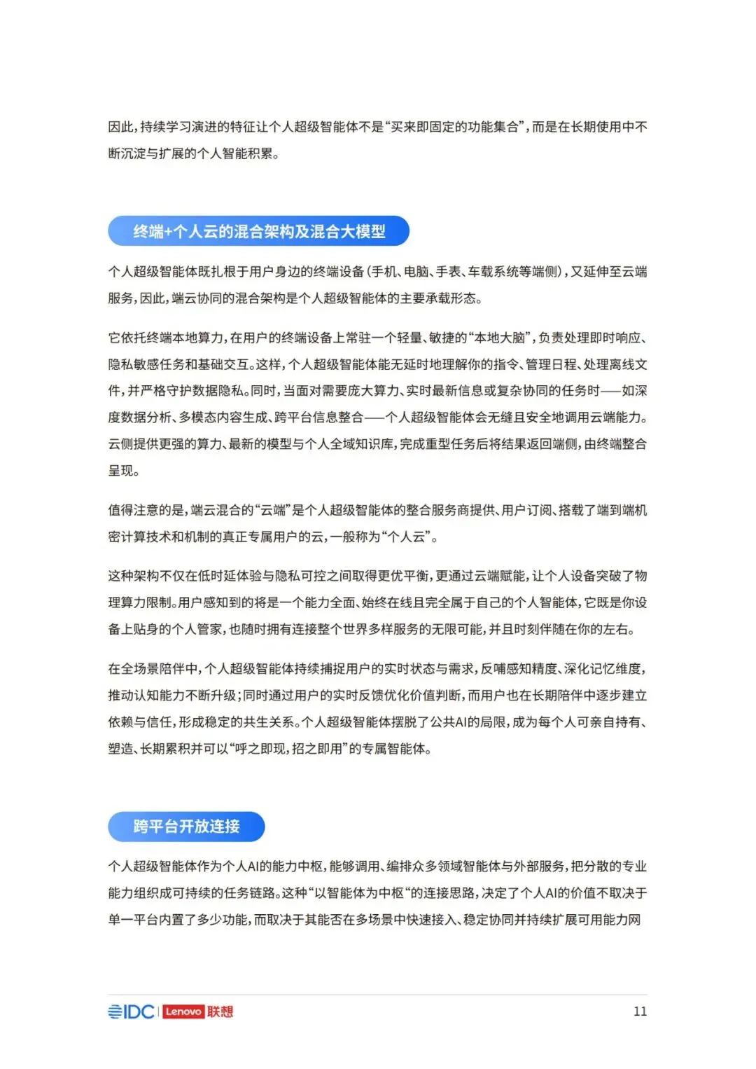 因此,面向未来,如何在充分释放AI潜力的同时,构建可持续、可协作且以人为中心的产业新生态,已 成为推动行业发展的核心议题。 本报告以用户为中心,立足于产业与生态,系统阐述个人AI时代来临的产业逻辑与必然趋势,厘清个 人AI的基础架构与核心特征,剖析其对产业链、价值链及竞争格局带来的结构性变革。报告亦将对个 人AI主导的未来生态进行前瞻展望,并为产业各方协同推进技术普及与生态共建,提供框架性建议 与行动倡议。