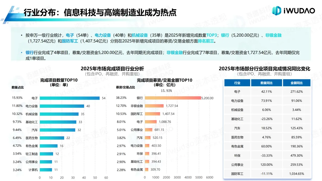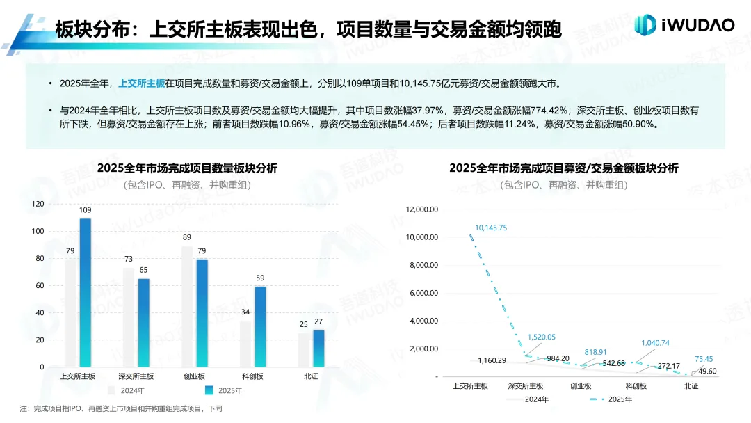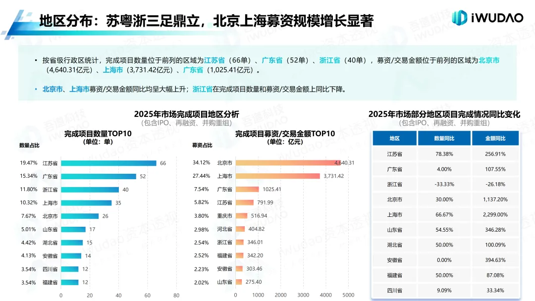 核心是规模放量与结构分化的双重凸显。全年股权融资项目达339家,募资金额超1.36万亿元,IPO、再融资、并购重组均实现同比大增,50亿元及以上大额项目增至36单,含5家千亿级项目。结构上,上交所主板以109单项目、超1.01万亿元募资额稳居首位,叠加苏粤浙区域三足鼎立、京沪募资规模暴增的态势,资金持续向核心板块、重点区域及战略新兴产业集聚,政策驱动下季度融资规模始终保持高位。
