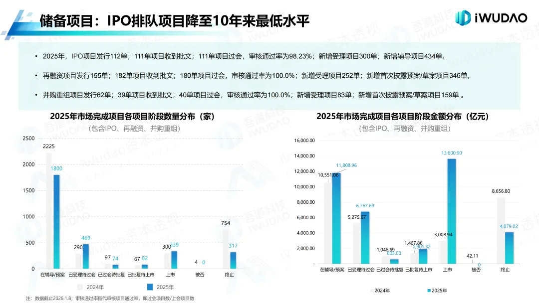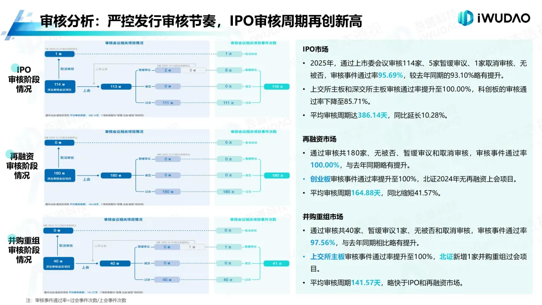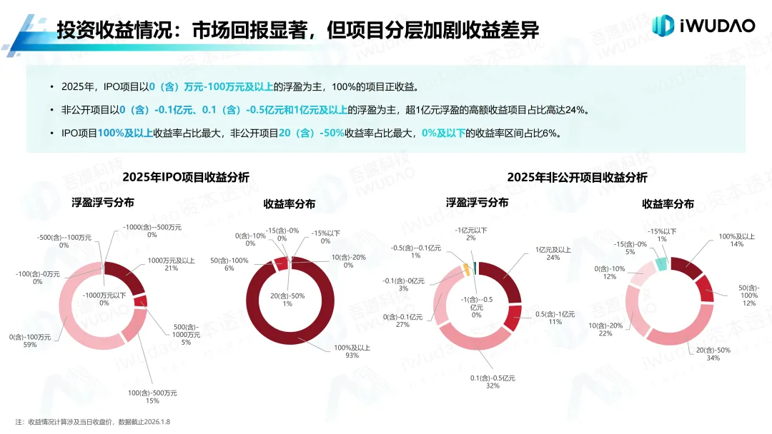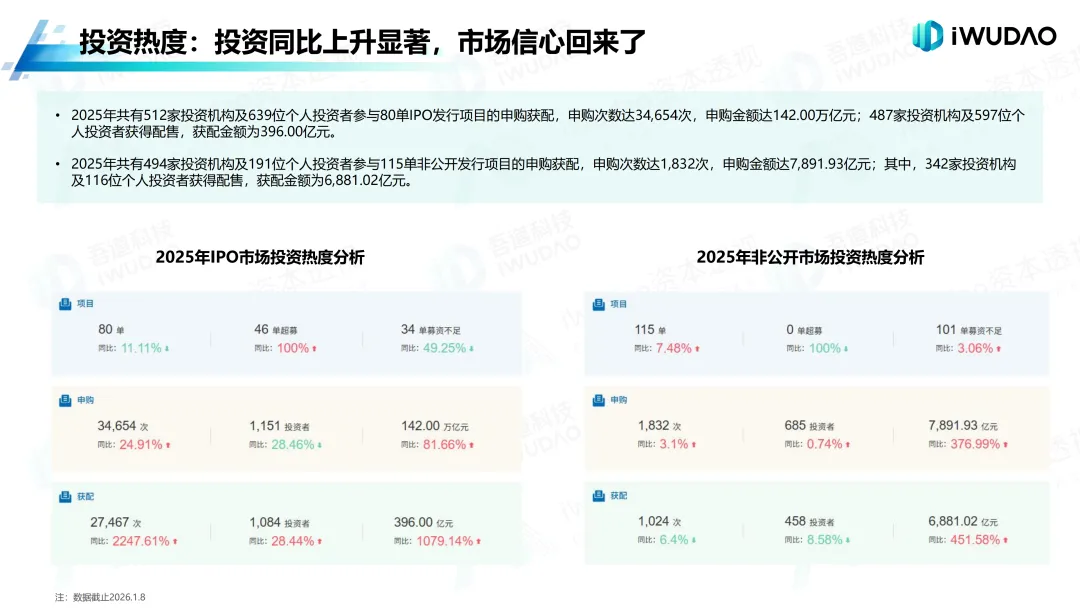 审核端呈现差异化调控态势,IPO审核通过率升至98.23%,但周期略有延长,再融资与并购重组审核通过率均达100%,且再融资审核周期大幅缩短41.57%,市场撤否情况显著改善。投资端信心全面回暖,IPO项目实现100%正收益,九成以上项目收益率超100%,非公开项目大额浮盈占比提升。资金参与度激增,IPO申购金额达142万亿元,非公开申购金额同比增幅超370%,形成收益与参与度双向提升的格局。