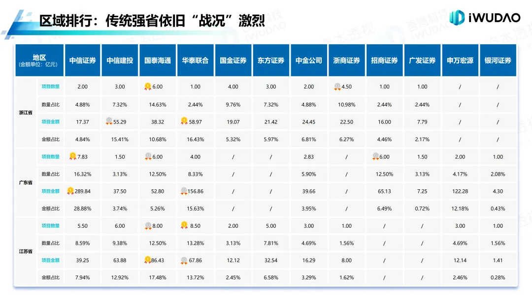 市场呈现头部主导、分层竞争的格局,叠加券业并购浪潮下的资源整合效应。中信证券以46.31单项目、2889.94亿元募资额稳居榜首,国泰海通、中信建投紧随其后,三者在大额项目、国企客户及核心板块占据绝对优势。中小型券商则聚焦20亿元以下中小项目,部分券商凭借细分行业专注度抢占民营企业市场,东方证券、申万宏源实现金额同比爆发式增长。苏粤浙京沪成为核心竞争区域,头部券商在重点省份的项目与金额占比显著领先,差异化布局凸显行业发展韧性。