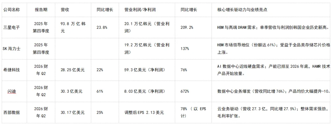 利润增长远超营收增长:所有企业均呈现出利润增速数倍于营收增速的特征。这表明驱动业绩的核心因素不仅是“量增”,更是“价涨”与“产品结构优化”。闪迪高达672%的净利润增长和三星电子超过200%的营业利润增长,是这一趋势的极致体现。