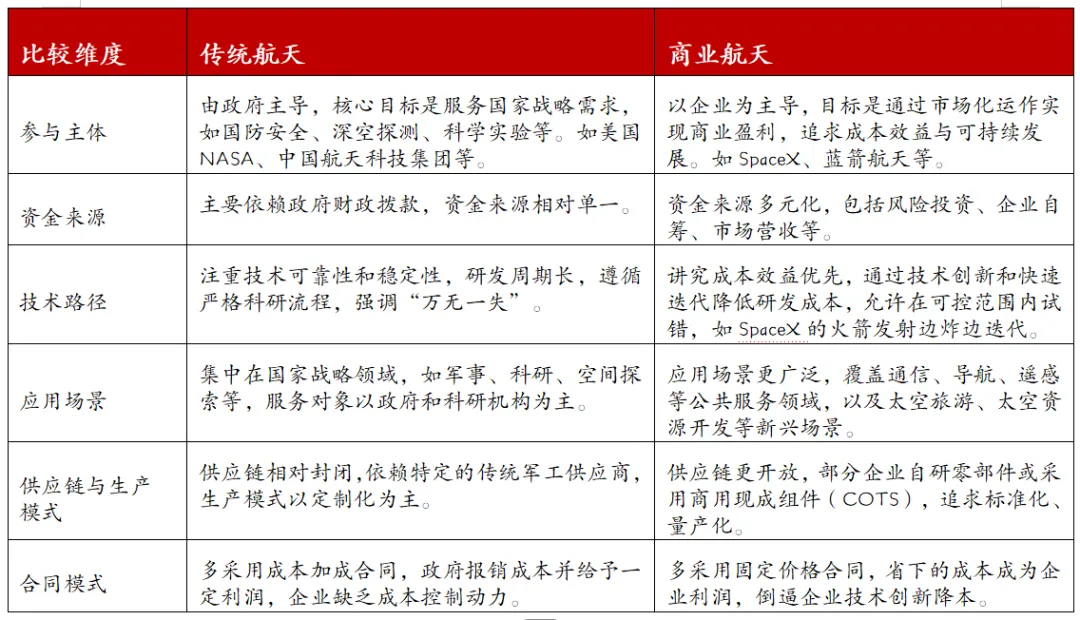 与传统航天相比,商业航天在驱动机制、资源分配和目标导向上存在本质区别。传统航天主要由政府主导,侧重于国家战略需求,如国家安全、深空探测和科学实验,其发展基于国家意志和长期规划,以技术突破和战略安全为主要目标。而商业航天则以市场为导向,追求商业利润最大化,通过满足多元化市场需求实现可持续发展。