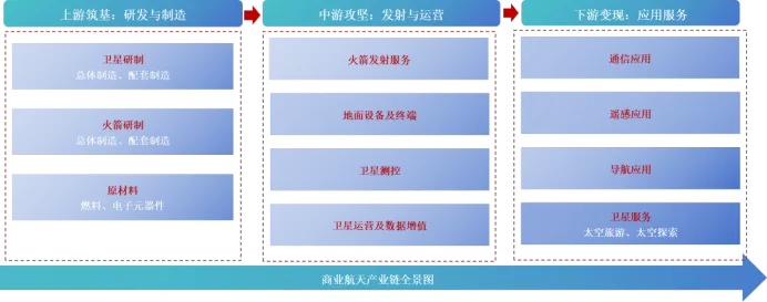 商业航天产业链条长,协同效应强,呈现出清晰的“基础—制造—应用”三层价值结构。作为新质生产力的典型代表,商业航天推动全产业链创新,从新材料、精密制造到电子信息、数据应用等。这种贯穿产业链的强劲联动,正塑造出“星在轨、箭待发、船测控、链贯通”的现代化航天产业新生态。
