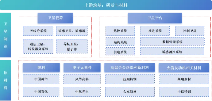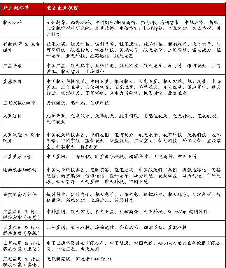 核心零部件:涵盖星载相控阵芯片、星敏感器、火箭发动机泵系统等关键部件,技术壁垒高,国产化进程直接影响产业自主可控能力。代表企业包括铖昌科技、天银机电、航天动力等。