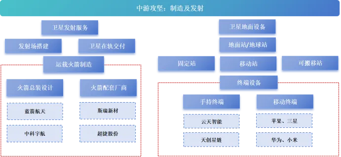 测控系统:为火箭发射和卫星在轨运行提供跟踪、测量和控制服务,保障任务顺利推进,代表企业包括航天智装等,其测控仿真系统覆盖范围广、可靠性高。