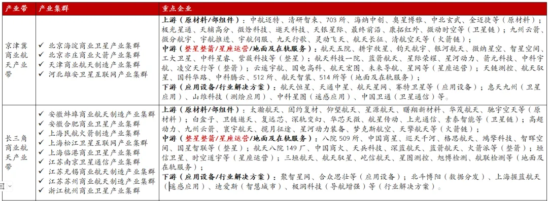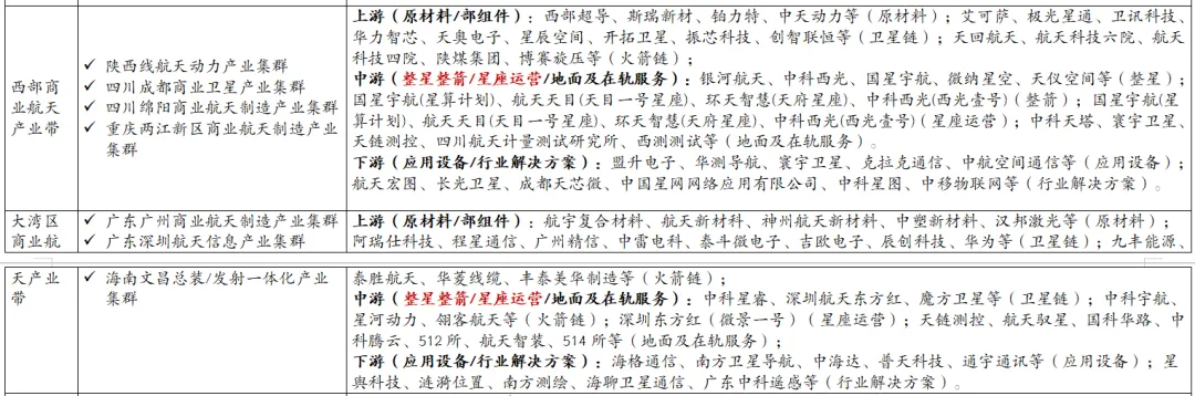 中国商业航天产业可大致划分为京津冀、长三角、西部和大湾区这4大产业带,以及28个具有地方特色的产业集群。包括京津冀、长三角、大湾区、西部商业航天产业带等。国内注册并有效经营的商业航天企业近600家。