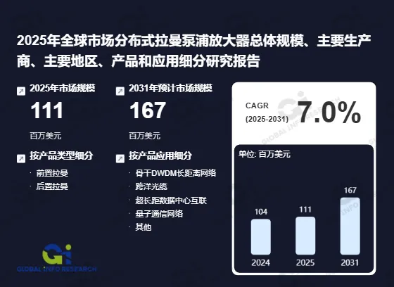 据GIR(Global Info Research)调研,2024年全球分布式拉曼泵浦放大器市场规模约为1.04亿美元,销量约7,800台,平均单价高达12,950美元,行业毛利率维持在38%–42%的高水平。预计到2031年,市场将增长至1.67亿美元,2025至2031年间以7.0%的年复合增长率稳健前行。这一高技术门槛、高附加值的细分赛道,正随着全球带宽需求激增和光网络向极致性能演进而持续升温。