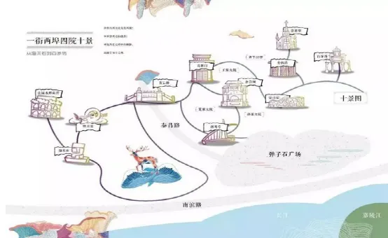 80米高差的长弹子石老街上按照“一街两埠四院十景” 的景观打造。“一街”即弹子石老街,“两埠”即下江和上埠,“四院”指王家大院、孙家花园、夏家大院、青阳公馆,“十景”则是海关石、映月池、青云桥、花朝门、余音阁、利川号、涂山窑、爱情墙、一德堂、百岁坊。