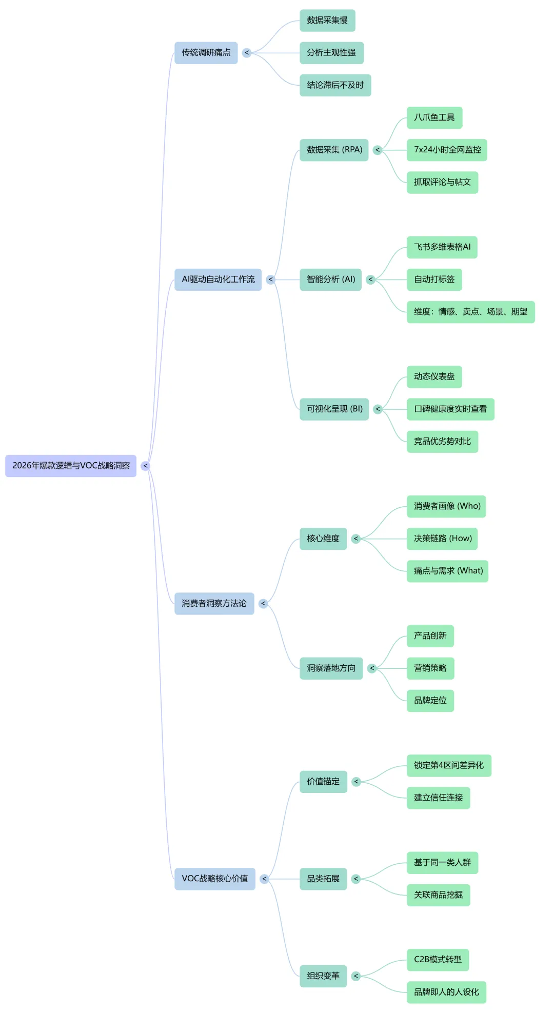 详细讲讲AI驱动的消费者洞察(VOC)战略及其在2026年打造爆款产品的逻辑。其核心在于利用RPA自动化工具高效抓取多渠道数据,并结合人工智能进行深度的语义解析,从而精准描绘用户画像与决策路径。通过构建动态可视化看板,企业能够实时监测品牌声量、识别竞品优劣并挖掘用户未被满足的痛点。这种从流量思维向价值锚定的转型,旨在通过建立C2B组织变革,实现基于真实反馈的产品创新与品牌定位。最终,该系统将碎片化的评论转化为可落地的商业决策,协助品牌在存量市场中通过差异化竞争获取持续增长。