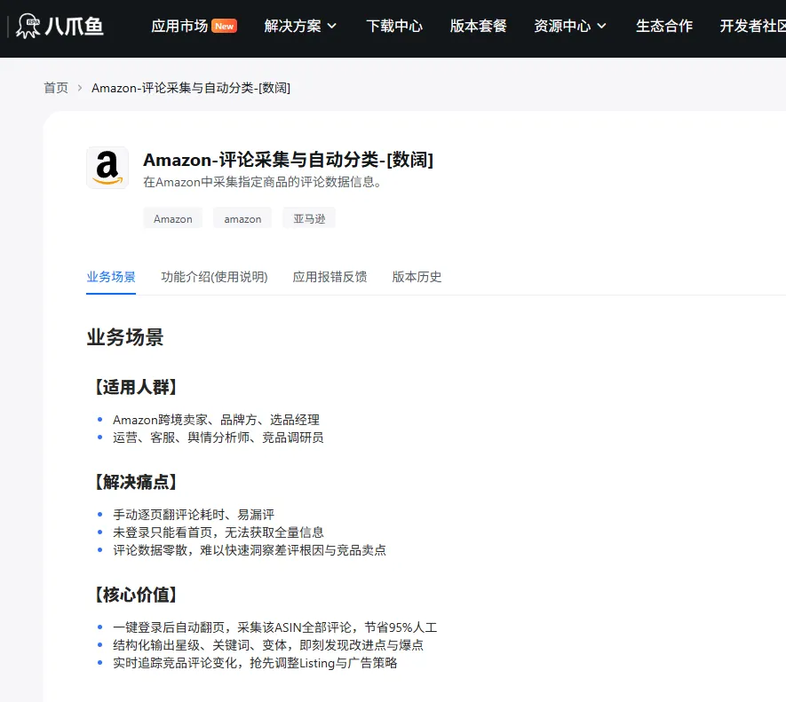 八爪鱼RPA这样的工具,就能扮演这个角色。你不需要懂代码,用我们预设好的应用模板,告诉它你想监控哪些竞品的亚马逊链接、哪些社媒话题就行。