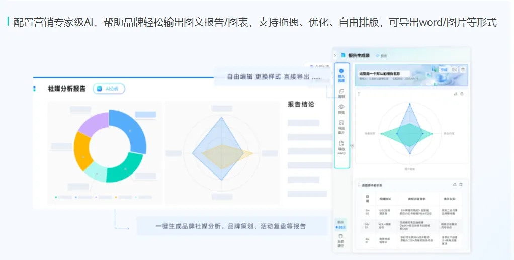 能力:支持报告内容的拖拽优化、自由排版,并可导出为Word或图片格式,极大提升报告撰写效率。