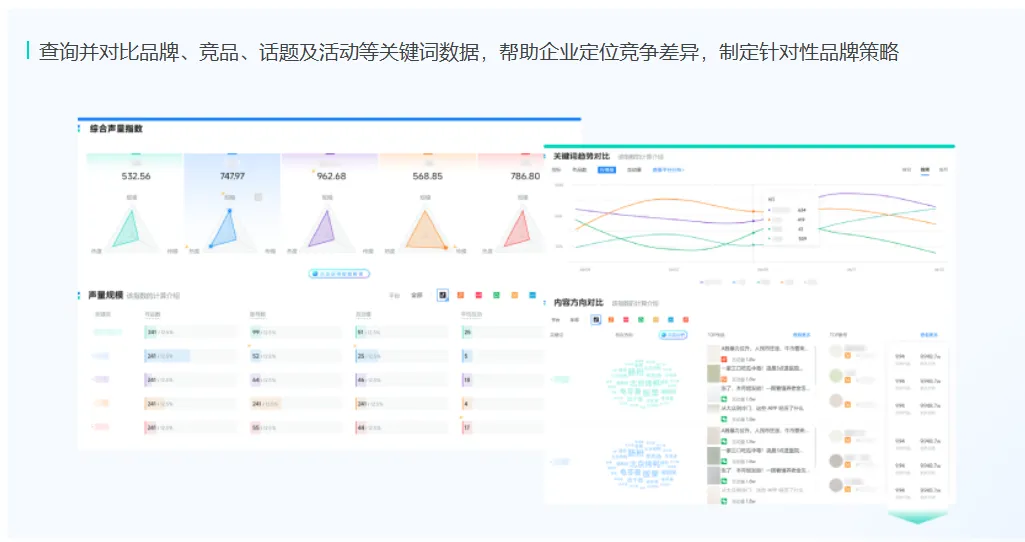 功能:一屏对比本品牌与竞品在声量指数、趋势、内容方向、发布者分析等多维度数据。