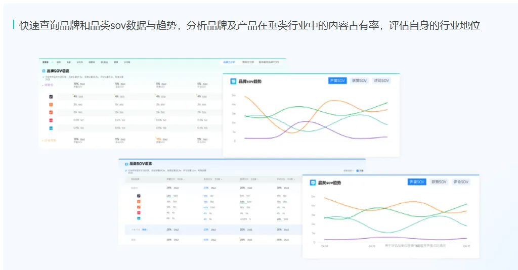 1.功能:衡量品牌在特定垂类行业中的内容占有率,包括总声量SOV、互动SOV等。