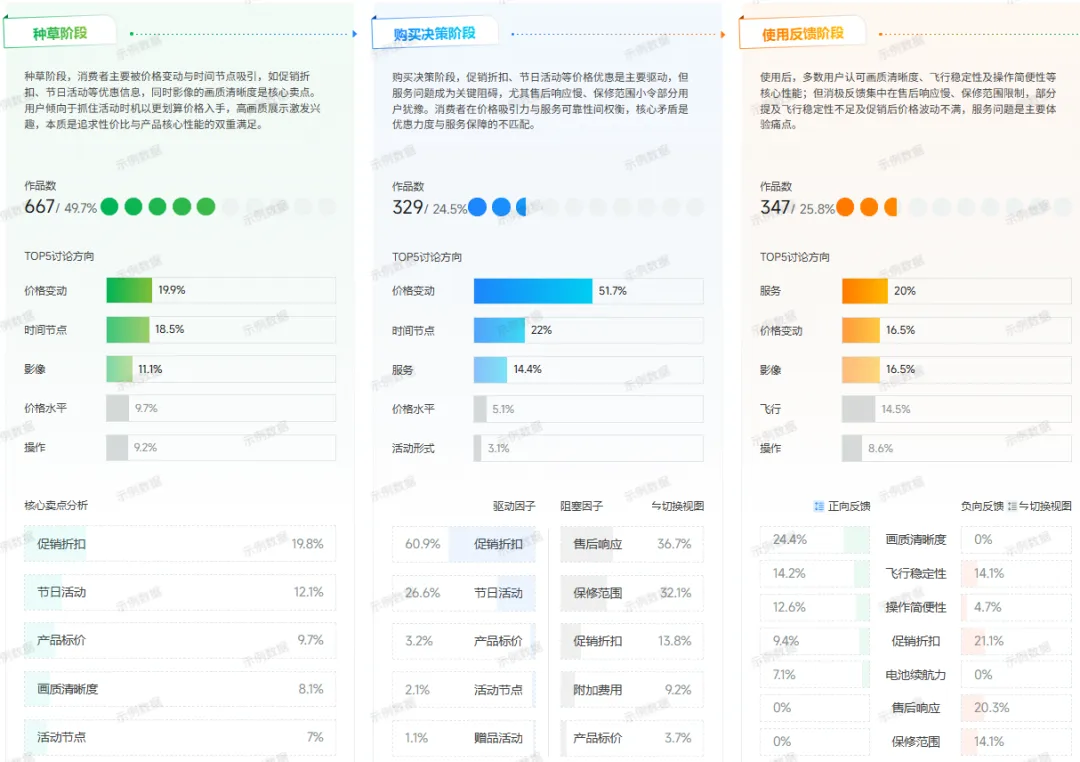 内容:分阶段(种草、购买决策、使用反馈)分析用户的关注点和行为。例如,大疆用户在种草阶段关注价格和画质,购买时权衡优惠与服务,使用后反馈集中于产品稳定性和售后服务。