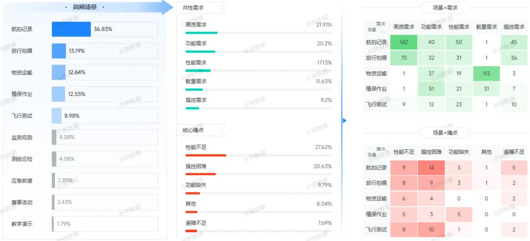 内容:通过矩阵分析场景与需求、场景与痛点的关系。例如,大疆的“航拍记录”场景对应高“画质需求”,但痛点在于“操控困难”;“物资运输”场景则对“载重需求”高,但“载重能力弱”是主要痛点。