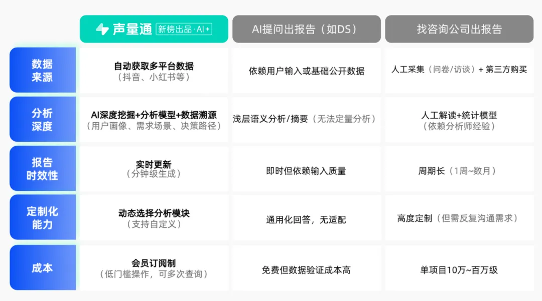 文档最后强调了声量通相较于传统咨询报告或通用AI工具的核心优势: