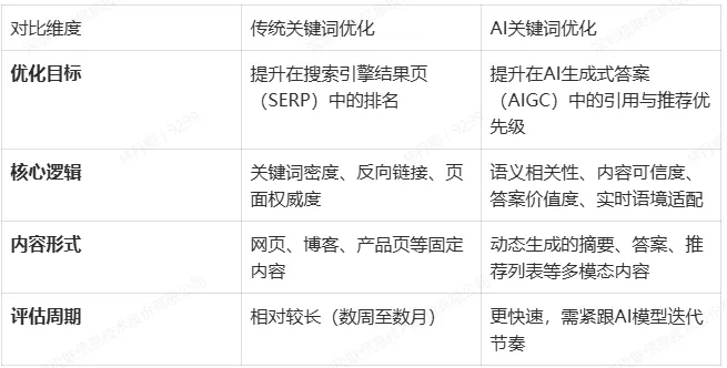 传统的关键词优化主要围绕页面元素(如Title、Meta、H1)和外部链接,针对关键词与网页内容的相关性进行静态优化。而AI关键词优化是一项更高级别的战略,它专注于如何让品牌信息被各类AI生成式引擎(如DeepSeek、豆包、文心一言等)识别、采纳并优先推荐给用户。