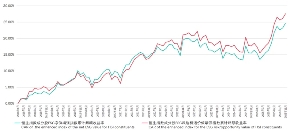 ESG价值核算方法可以用于投资组合的构建。如果应用于指数增强策略,以恒生指数作为基准,选取ESG净值、ESG风险机遇价值因子构建价值增强指数。回测显示,两项指数从2018年以来的回报比基准指数分别超过了22%、25%。