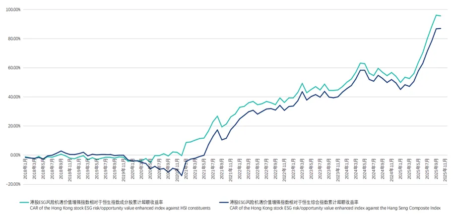 用于正面筛选策略,如果从恒生综合指数、恒生指数中选取ESG风险机遇值前25%的成分股,组成投资组合。回测显示该组合2018年以来的回报超过了基准指数约90%。
