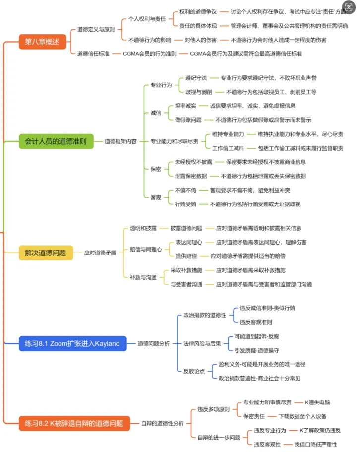 第八章围绕商业道德展开,重点阐述了道德定义、CGMA会员的道德标准,会计人员的道德准则、以及通过案例分析解决道德问题的思路。概述