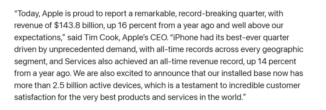 本季度苹果毛利率为48.2%,同比有所提升,表现稳健。服务业务收入占比约20.9%,为毛利润作出显著贡献。库克在声明中表示:“iPhone在所有地区均创下历史销售纪录,这是公司史上最强劲的一个季度。”