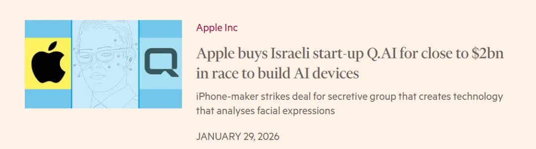 据路透社与《金融时报》等媒体报道,在发布最新财报的同日,苹果公司宣布已收购以色列人工智能初创公司Q.ai。报道称,此次交易价值约20亿美元,是苹果近十年来规模第二大的收购案。