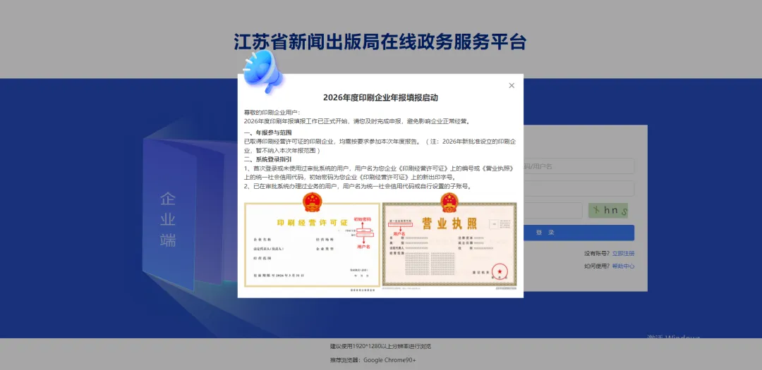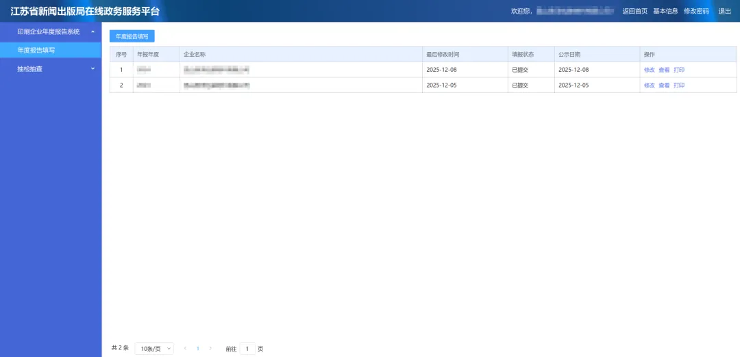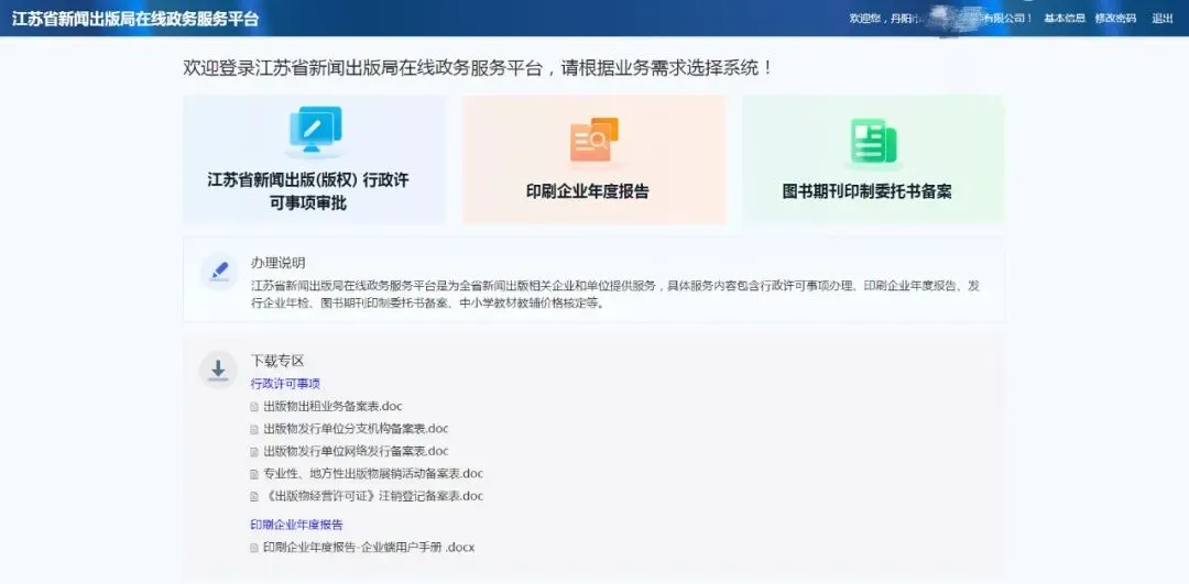 登录系统,进入首页,页面下方会展示印刷企业年度报告用户手册: