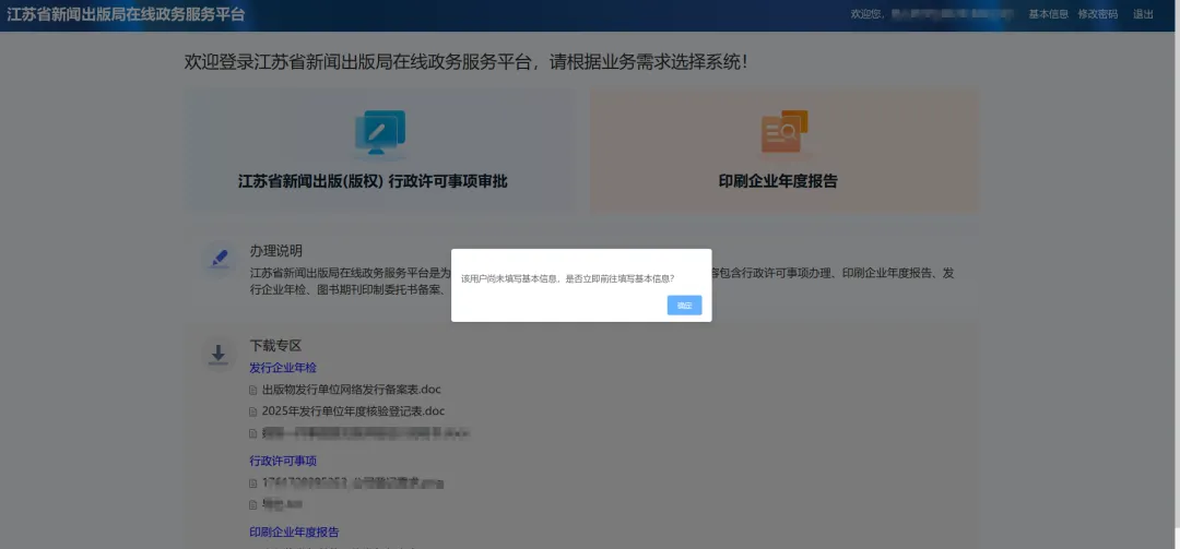 用户输入用户名、密码登录系统后,首次进入首页需要前往维护基本信息,系统弹出基本信息维护提示: