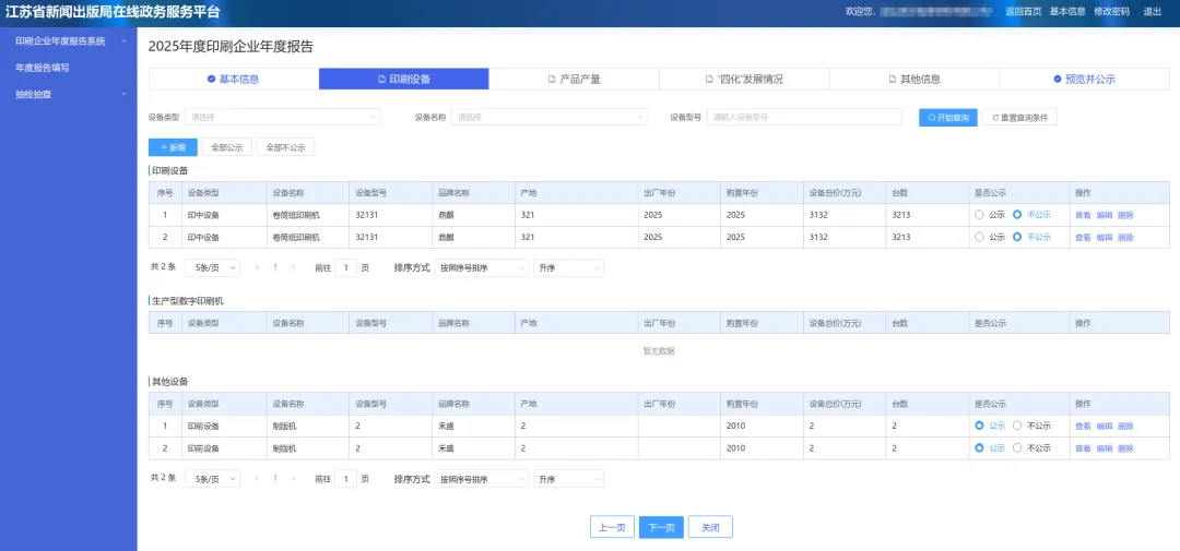 填写完成之后点击【确定】按钮,系统弹出提示“保存成功”,保存成功后点击【下一页】按钮,进入【印刷设备】填写页面。