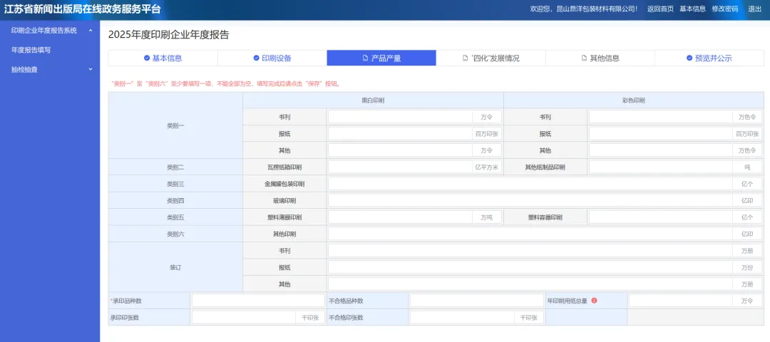 【产品产量】页面:“类别一”至“类别六”至少要填写一项,不能全部为空,填写完成后请点击“保存”按钮。