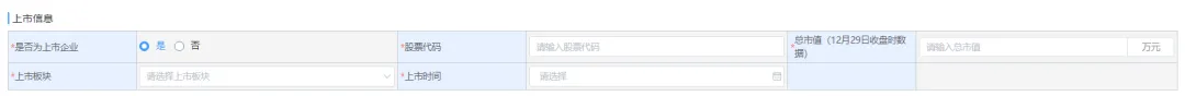 上市信息中“是否为上市企业”勾选“是”后,展示对应信息,页面如下: