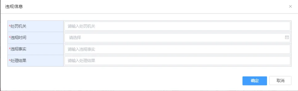 违规信息模块点击【新增】按钮,弹出违规信息填写页面,页面如下: