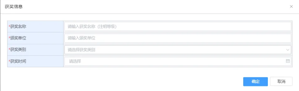 获奖信息模块中点击【新增】按钮,弹出获奖信息页面,页面如下: