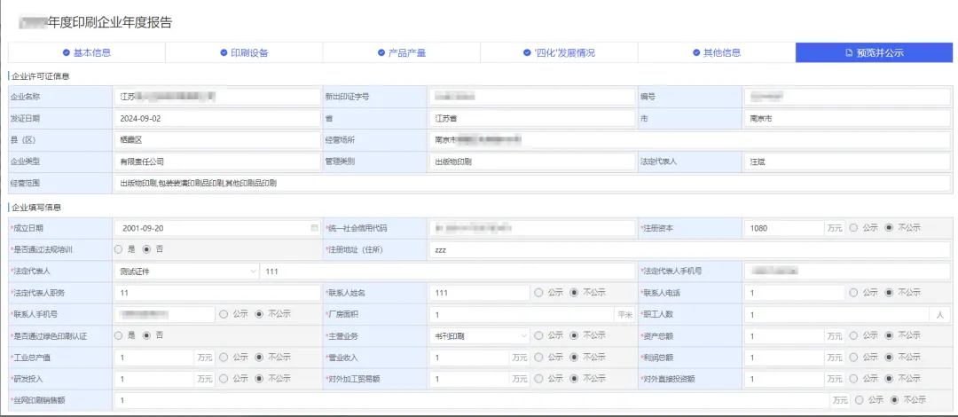 点击【打印预览】按钮,可生成对应年度的印刷企业年度报告表: