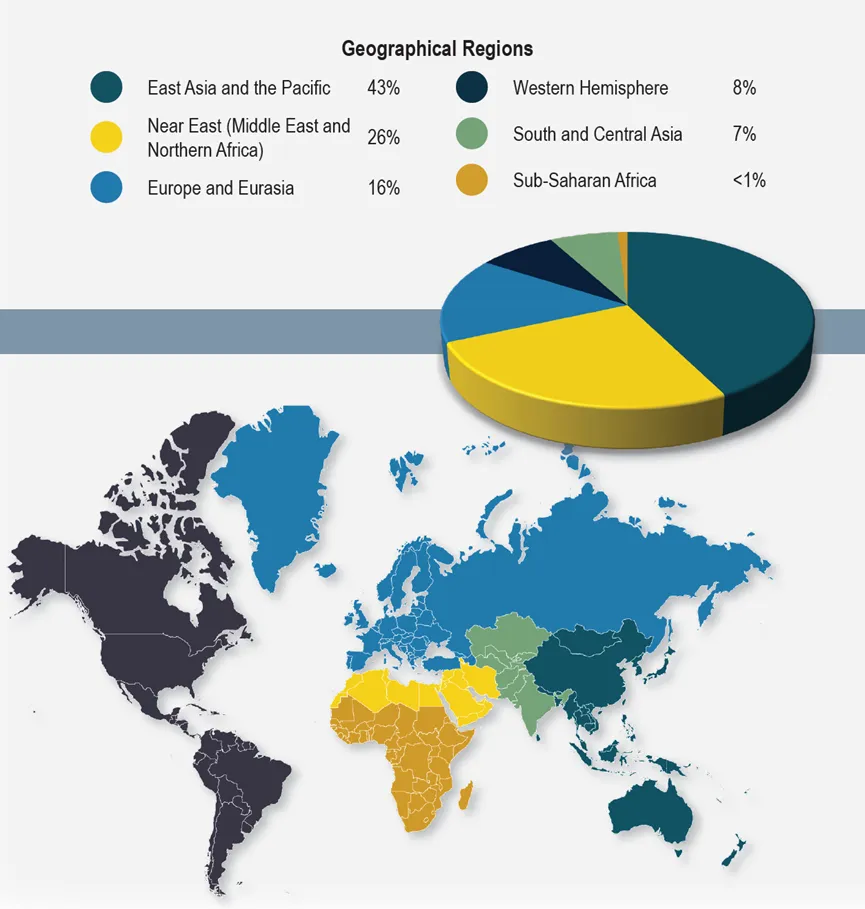 DCSA报告中最引人注目的数据在于区域分布。报告显示,在2024财年所有经确认的“非法获取技术尝试”中,来自“东亚与太平洋地区”的实体占比高达43%。虽然报告在部分行文中使用了泛指,但在其列出的地区国家列表中,“China”赫然在列。