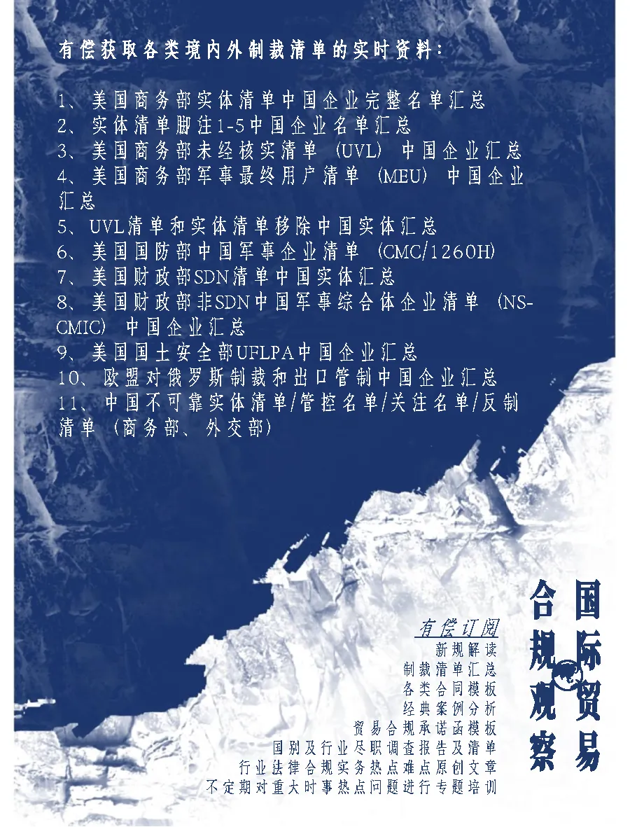 本公众号由行业领先的专业法律团队维护运营,聚焦于海关、出口管制、经济制裁及国际贸易衍生的法律工作,致力于成为企业跨境经营与国际贸易领域的合规智库,以专业视角追踪全球最新动态,为读者提供兼具时效性与深度的合规分析与实务指南。